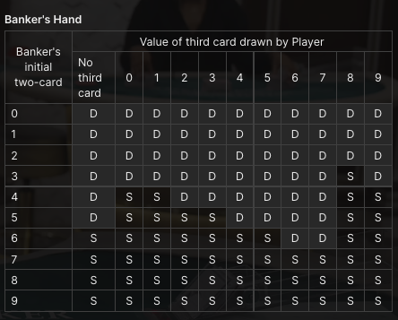 If the Player stands on 6 or 7, a Banker hand totaling 3, 4, or 5 must draw, while a Banker hand totaling 6 must stand. The hand closest to a total of 9 wins the game.