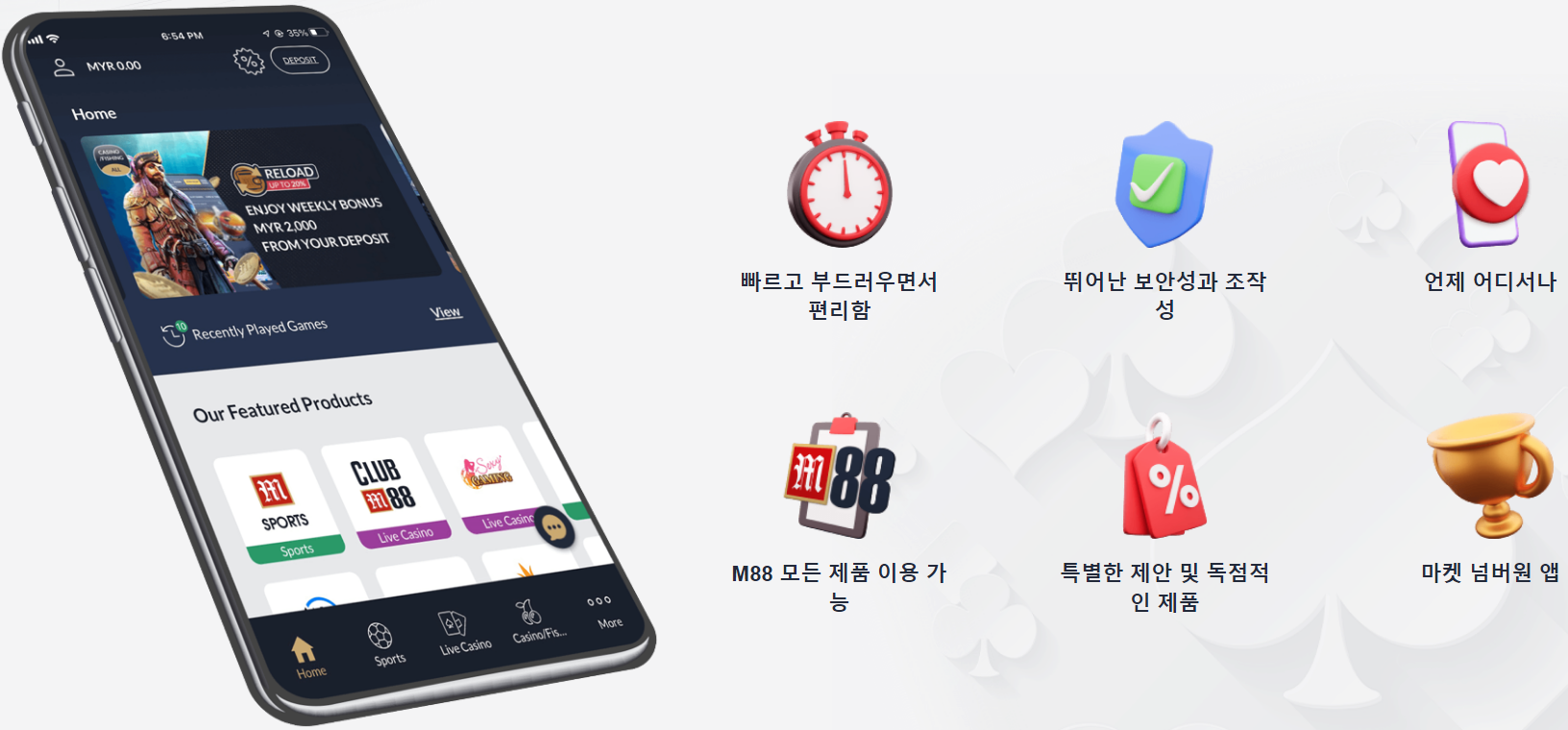 다른 온라인 베팅 앱들이 종종 느려지거나 복잡한 링크로 인해 사용자의 브라우저가 혼란스러워지는 것과 달리, M88 앱은 매우 원활하게 작동합니다. 이 앱을 사용하면 그 효율성을 직접 경험할 수 있고, 시장에서 가장 빠른 속도를 자랑합니다.
