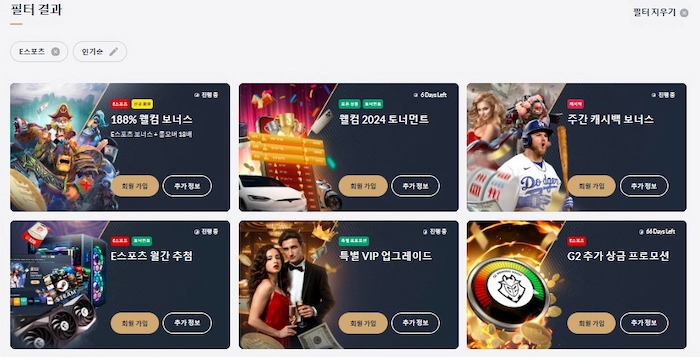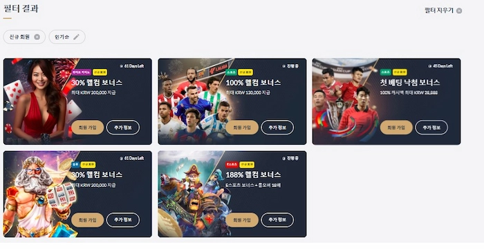 신규 가입자를 위해 최대 130,000원까지 100% 추가 금액을 제공하는 보너스와 최대 300,000원까지 30% 환영 보너스를 마련하고 있습니다. 이로써 신규 회원들은 자신의 베팅 자금을 효과적으로 늘릴 수 있는 좋은 기회를 갖게 됩니다.